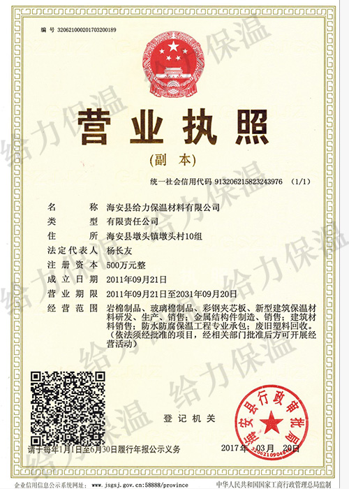 海安縣給力保溫材料有限公司(原海安縣創(chuàng)業(yè)保溫材料廠(chǎng))成立于1990年。公司位于江蘇省南通市海安縣墩頭鎮(zhèn),占地面積20畝,建筑面積12000㎡。